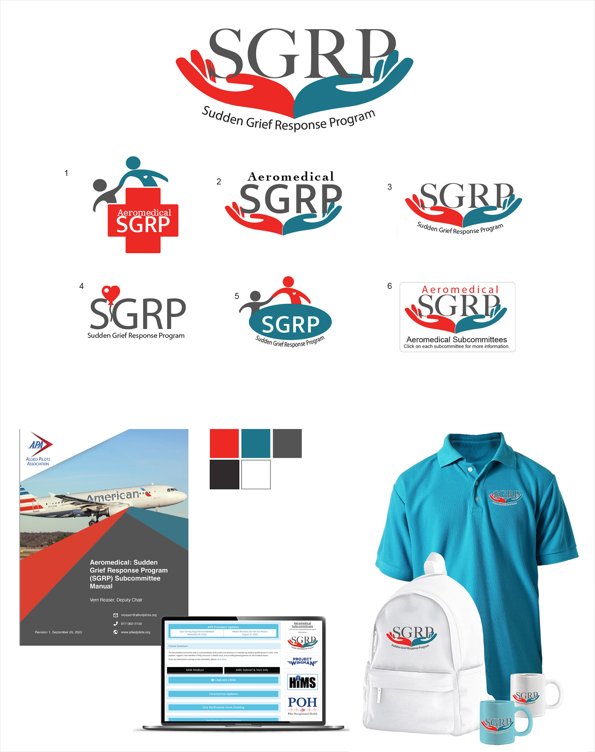 I was tasked with designing a logo for the Sudden Grief Response Program (SGRP), which is a subcommittee of the Aeromedical Committee at the Allied Pilots Association (APA). To ensure that the logo accurately reflected the program's mission and purpose, I took the time to understand their role: they serve as the first point of contact for pilots and their families during times of crisis, whether due to fatigue, illness, family challenges, or the loss of a loved one. The committee provides immediate, compassionate support and guidance in these deeply challenging moments. To maintain visual consistency, I incorporated the color palette from the program’s existing brochure. I then created six logo concepts, each designed to convey tenderness, empathy, and a strong sense of care. It was essential for the final logo to communicate not only professionalism but also the program’s unwavering commitment to being a comforting and supportive presence when it is needed most.